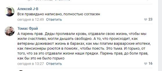 У Росії 9 травня молодий чоловік з Єкатеринбурга вийшов на акцію "Безсмертний полк" з плакатом з написом "Не за таку країну проливалася кров наших дідів", що викликало бурхливу реакцію серед користувачів російських соцмереж.