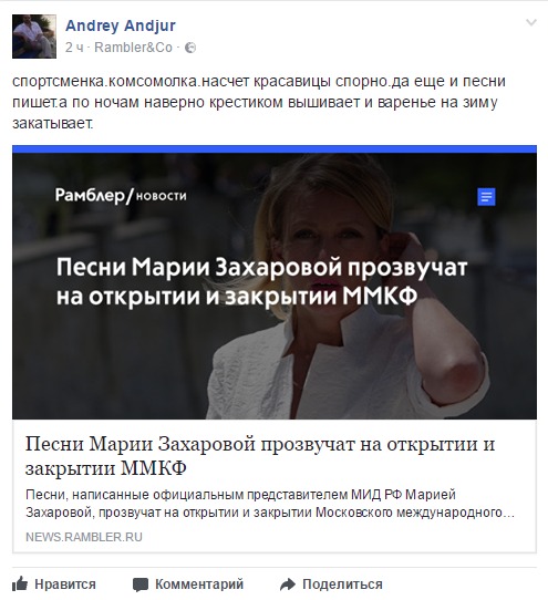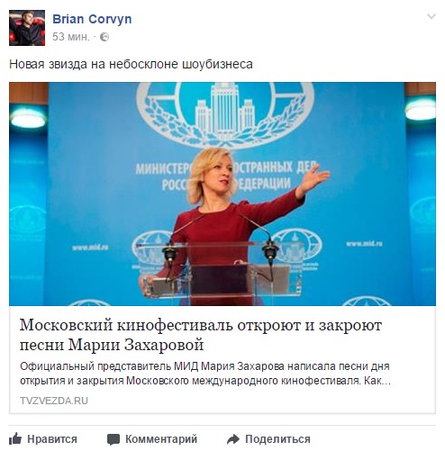 Звістка про те, що офіційний представник МЗС РФ Марія Захарова написала пісні, які звучатимуть на церемоніях відкриття і закриття Московського міжнародного кінофестивалю, викликала сміх у мережі.