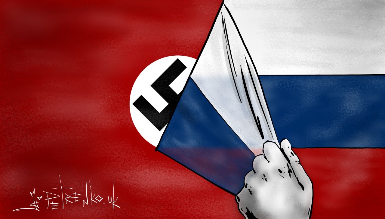 На малюнку зображена рука, яка зриває білі і сині смуги російського прапора, з-під яких з'являється червоне полотнище нацистського прапора зі свастикою.