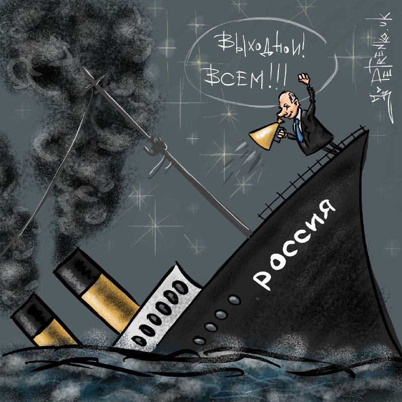 "Гуляють всі, як останній раз...", - підписав він ілюстрацію на ситуацію в РФ. На ній художник намалював пароплав, на якому стоїть президент Володимир Путін. Однак судно йде на дно.