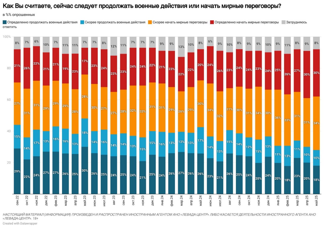 Кількість росіян, які виступають за проведення мирних переговорів з Україною, досягла максимуму за весь час досліджень - 64%.