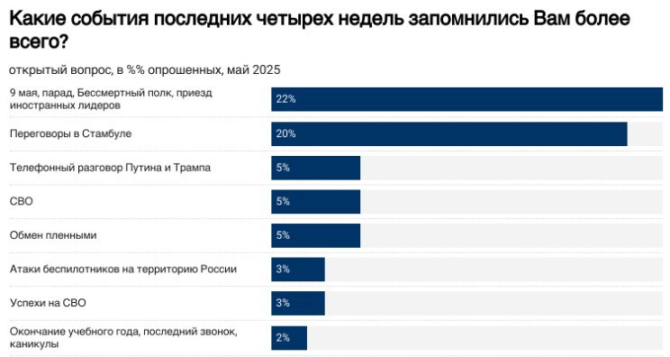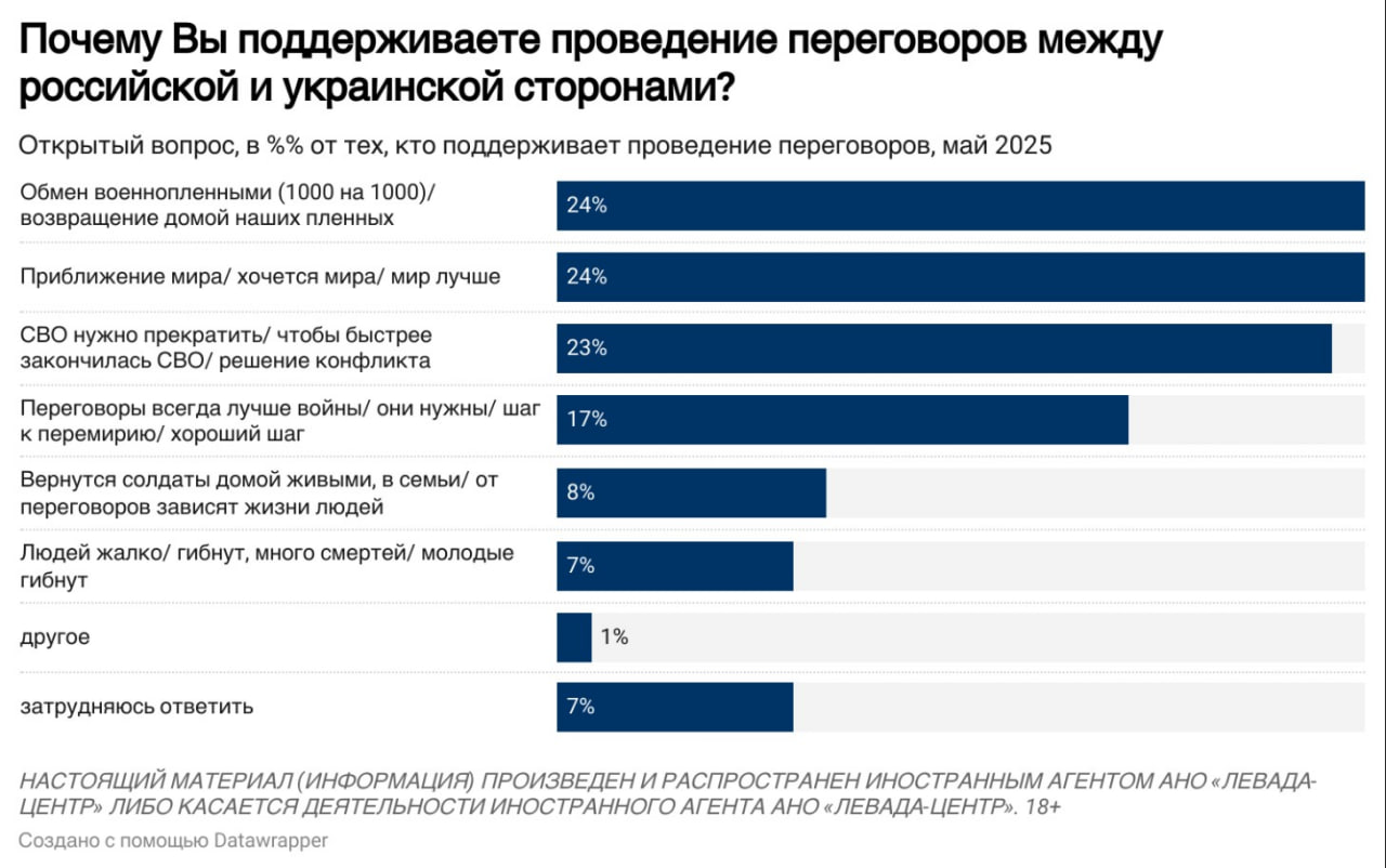 "На цьому тлі переважна більшість росіян (87%) підтримують перший раунд переговорів, що відбувся в Стамбулі. Однією з головних причин підтримки діалогу між обома сторонами опитані, крім "наближення миру", називають запит на проведення обміну військовополоненими і "повернення додому наших полонених". Також показово, що після серйозного спаду інтересу до війни, у травні загальний рівень уваги росіян до "подій навколо України" різко збільшився з 49% до 58%, а до топу подій місяця, які запам'яталися найбільше, увійшли перемовини в Стамбулі, телефонна розмова Путіна з Трампом та обміни полоненими", - говорять проєкти "Хочу жить".