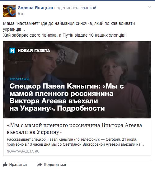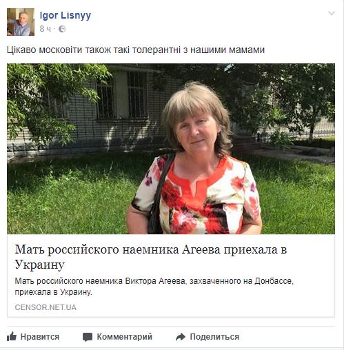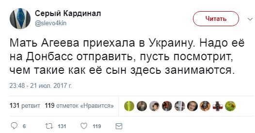 Також блогери висловлюють пропозицію відправити мати Агеєва на Донбас, щоб вона подивилася, чим займаються в Україні такі, як її син. І задаються питанням, чи відносяться так само милосердно до матерів незаконного засуджених у Росії українців і полонених.