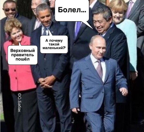 Автор взяв старе фото з міжнародного саміту за участю Путіна, де особливо помітний його низький зріст і прописав діалог між учасниками щодо лідера Росії. Зокрема, персонаж 44 президента США Барак Обама цікавиться чому верховний правитель "такий маленький", у відповідь йому кажуть, що той нібито "хворів".