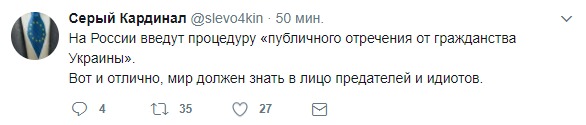 Пропозиція російських депутатів ввести процедуру публічного відречення від громадянства України для отримання російського знайшла емоційний відгук у користувачів мережі.