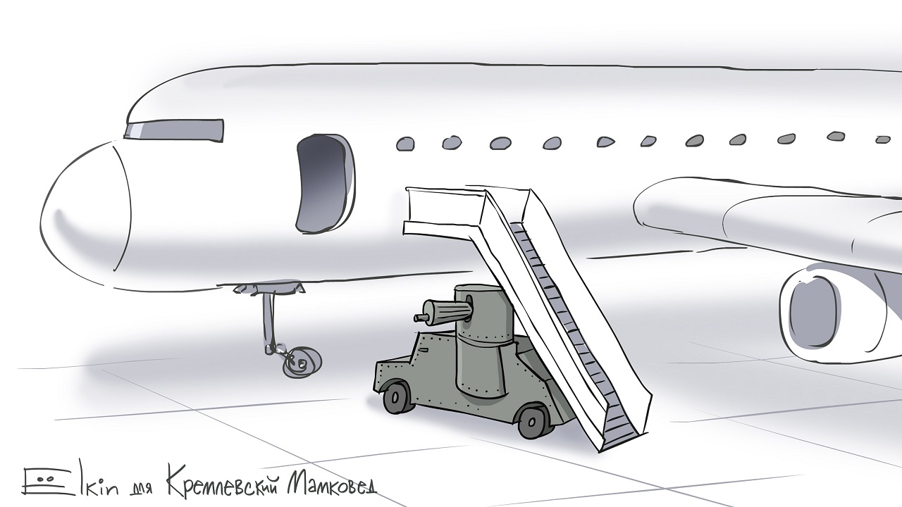 На малюнку, опублікованому в Twitter, під трапом літака зображено броньовик з кулеметом, який очікує на приліт опозиціонера.