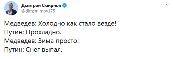 Діалог про прохолодну погоду між президентом РФ Володимиром Путіним і прем'єр-міністром Дмитром Медведєвим викликав бурхливу реакцію в мережі.