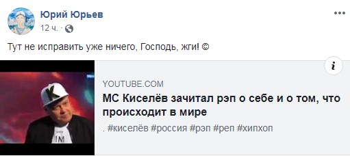 Також Кисельов згадав окупований Крим, санкції проти РФ і оголосив, що запрошує всіх на реп-фестиваль в Коктебель: "Все рвуть відносини з Росією, але це просто понти. Скільки б вони не спалювали, ми буде будувати мости".