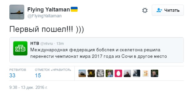 Новина про позбавлення РФ права на порідіння чемпіонату світу з бобслею розбурхала користувачів Twitter.