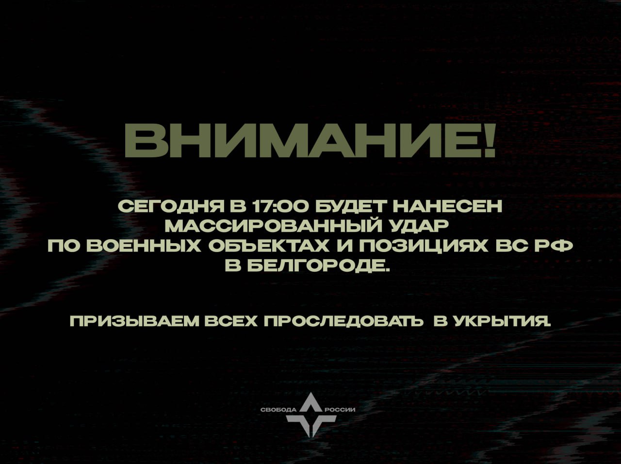 "Сьогодні о 17:00 (16:00 за київським часом - "Апостроф") буде завдано масованого удару по військових об'єктах і позиціях ЗС РФ у Бєлгороді. Закликаємо всіх, хто ще не встиг залишити регіон, негайно пройти в укриття!", - йдеться у повідомленні.