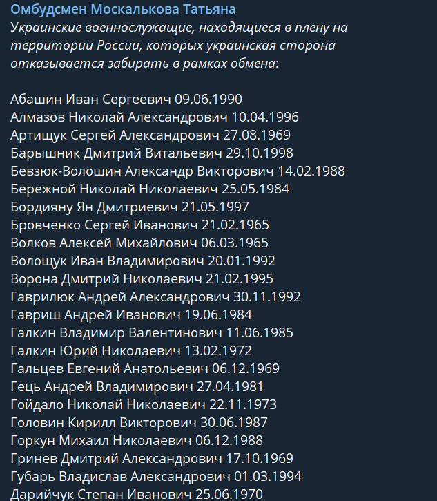 Так, Москалькова опублікувала у себе в Telegram список українських військовополонених - нижче наводимо скріни.