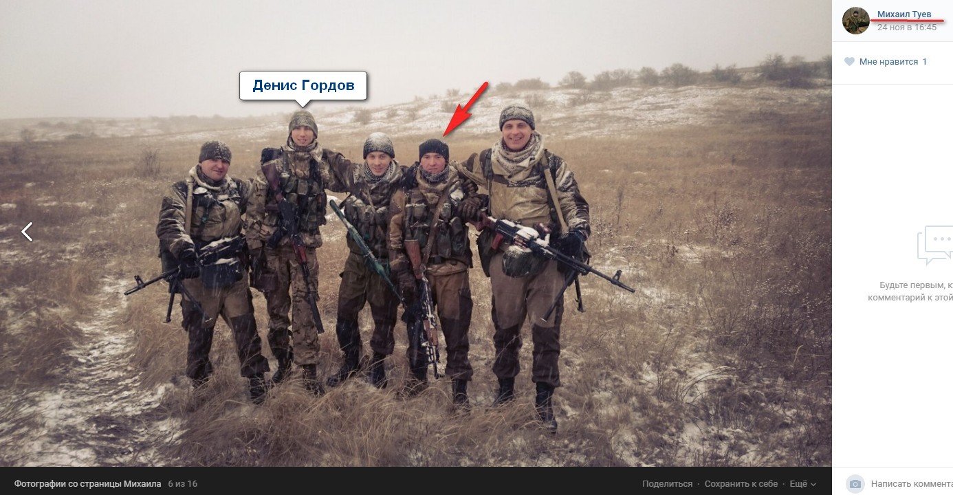 Волонтери приводять конкретні фотодокози участі Гордова в бойових діях на Донбасі.