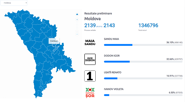 На виборах президента Молдови, які відбулися в неділю, 1 листопада, лідирує колишня прем'єр-міністр Майя Санду. За підсумками обробки 99,81% протоколів Санду набирає 36,10% голосів, чинний президент Ігор Додон набрав 32,66%.