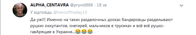 "Ха ... Рашіст прозрів в супермаркеті мацкви, коли побачив обробну дошку з назвою проспекту Степана Бандери (Київ). Скоро по всій Расєє такі обробні будуть для рашістов", - сказано в повідомленні.