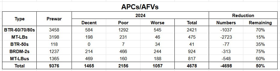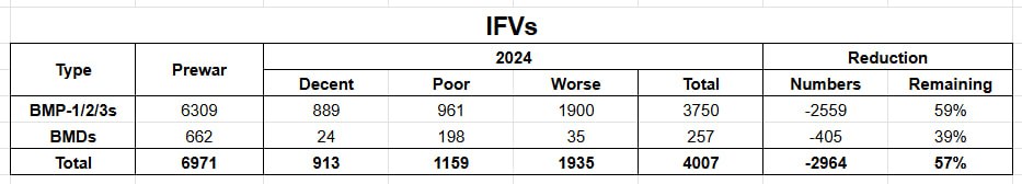БМП/БМД. Росіяни зняли 2964 бойові машини цього класу, або 43% від довоєнних. З тих, що залишилися, лише 913 виглядають такими, що мають нормальний технічний стан. Майже все – БМП, БМД практично не залишилося.