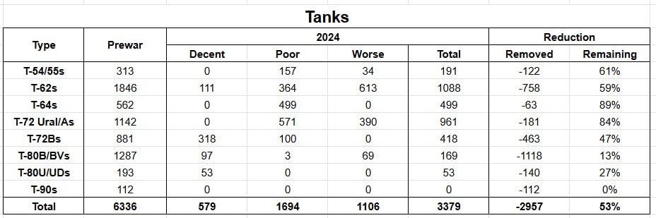 Танки. Росіяни зняли з баз зберігання щонайменше 2957 танків, або 47% від того, що було. З тих, що залишилися, тільки 579 мають нормальний технічний стан.