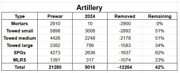 Артилерія. Росіяни зняли 12 264 одиниці артилерійських систем, або 58%. Найбільше у відсотковому співвідношенні знімали міномети, РСЗВ і великокаліберні буксовані гармати.