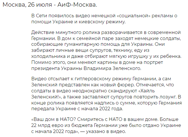 У невеликому відео показано будинок "звичайної" родини у сучасній Німеччині. До нього заходить група людей у формі військового крою, яка виносить усе майно з квартири на "потреби України", вішає на стіну портрет президента Володимира Зеленського зі словами "Хайль, Зеленський".
