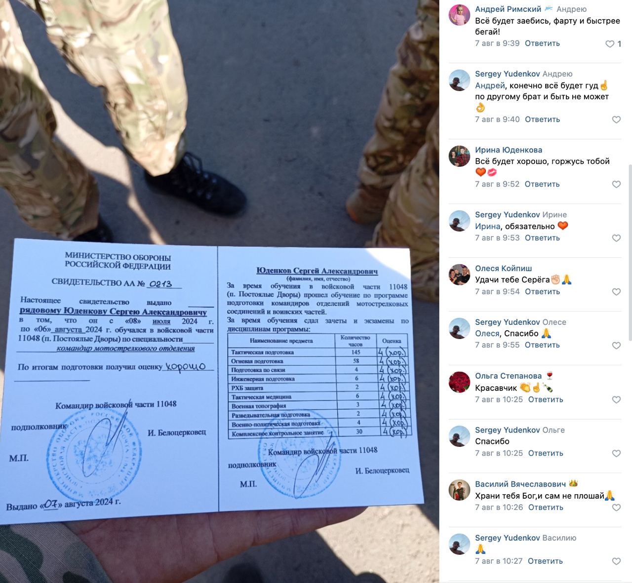 Фото з соціальних мереж підтверджують, що за два дні до смерті і Сєргєй Юденков, і Ігорь Горячьов закінчили навчання на полігоні під Курськом. Обидва навчались за спеціальністю "командир мотострілкового відділення".