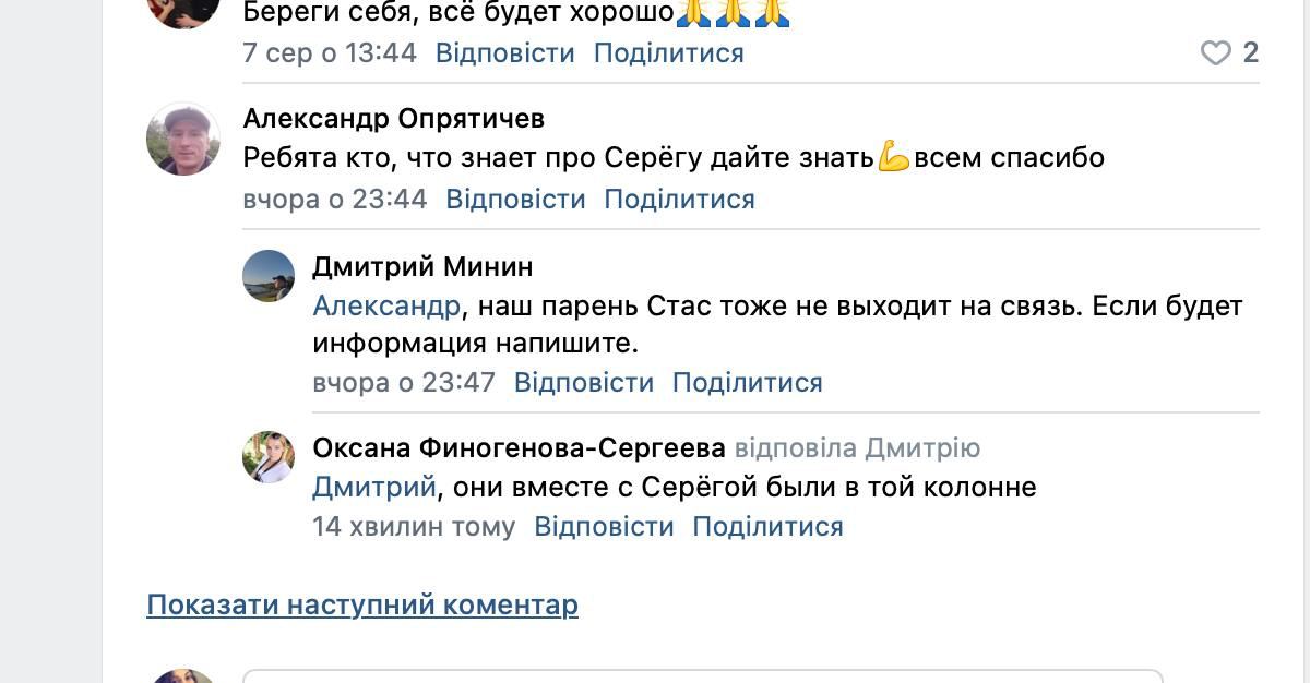 "Юдєнков востаннє заходив на свою сторінку 8 серпня о 23:48, тобто за кілька годин до знищення колони. В коментарях друзі Юдєнкова підтверджують, що він кілька днів не виходить на зв"язок і що він був в колоні. Серед фотографій на його сторінці ми ідентифікували співслуживця Юдєнкова – Ігоря Горячьова. Він теж не на зв'язку – востаннє Горячьов був в онлайні 8 серпня, близько десятої вечора", - розповідають журналісти.