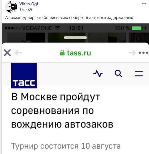 "Про змагання автозаків ми прочитали в коридорі суду і довго сміялися над жартом. Але життя завжди смішніше і виявилося, що новина справжня", - пише журналістка "Еха Москви" Ірина Воробйова.