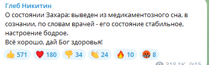 "Про стан Захара: виведений з медикаментозного сну, у свідомості, за словами лікарів - його стан стабільний, настрій бадьорий", - написав Нікітін.