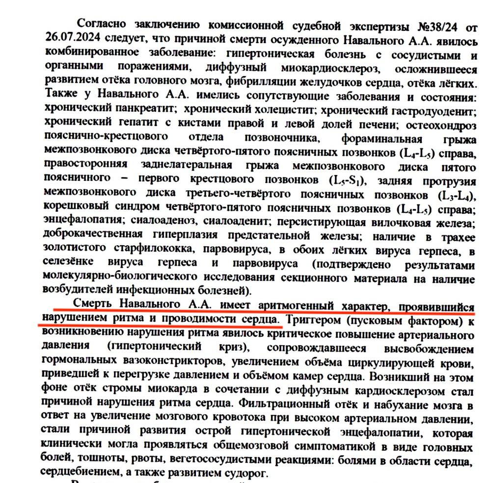 Документ засвідчує, що помер політик через "комбіноване захворювання". Росмедіа зауважують, що "під час розтину в Навального знайшли цілий букет хронічних хвороб - від панкреатиту до гриж". Натомість тромб, про який кремлівські медіа активно писали у день смерті Навального, у документі не згадали.