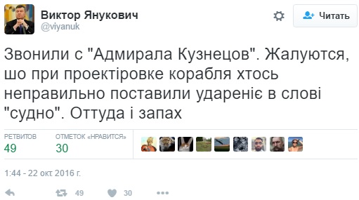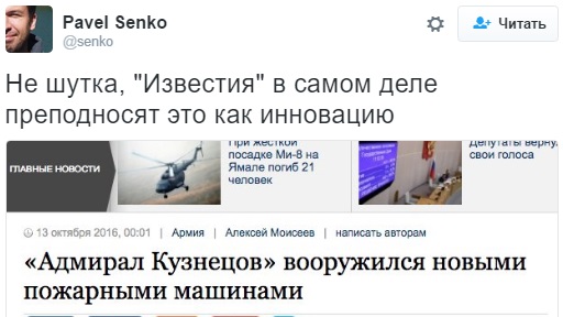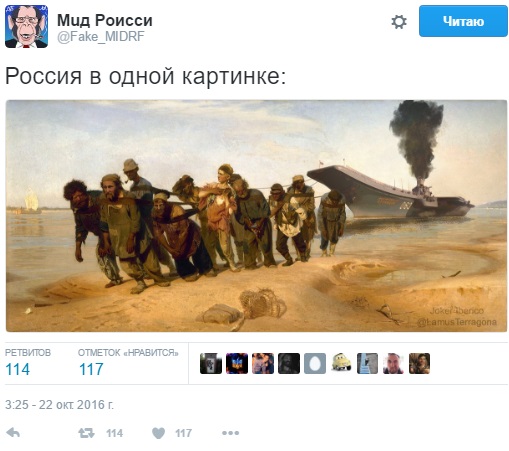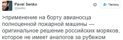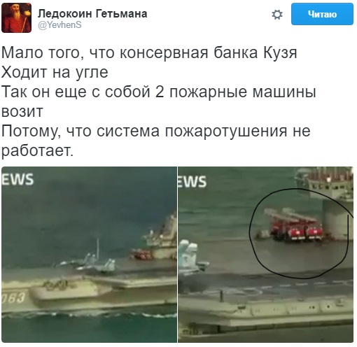 Зокрема, вже який день в мережі проходить парад жартів над "Адміралом Кузнєцовим", який зневажливо охрестили "Кузею". На російському авіаносці навіть знайшли пожежні машини.