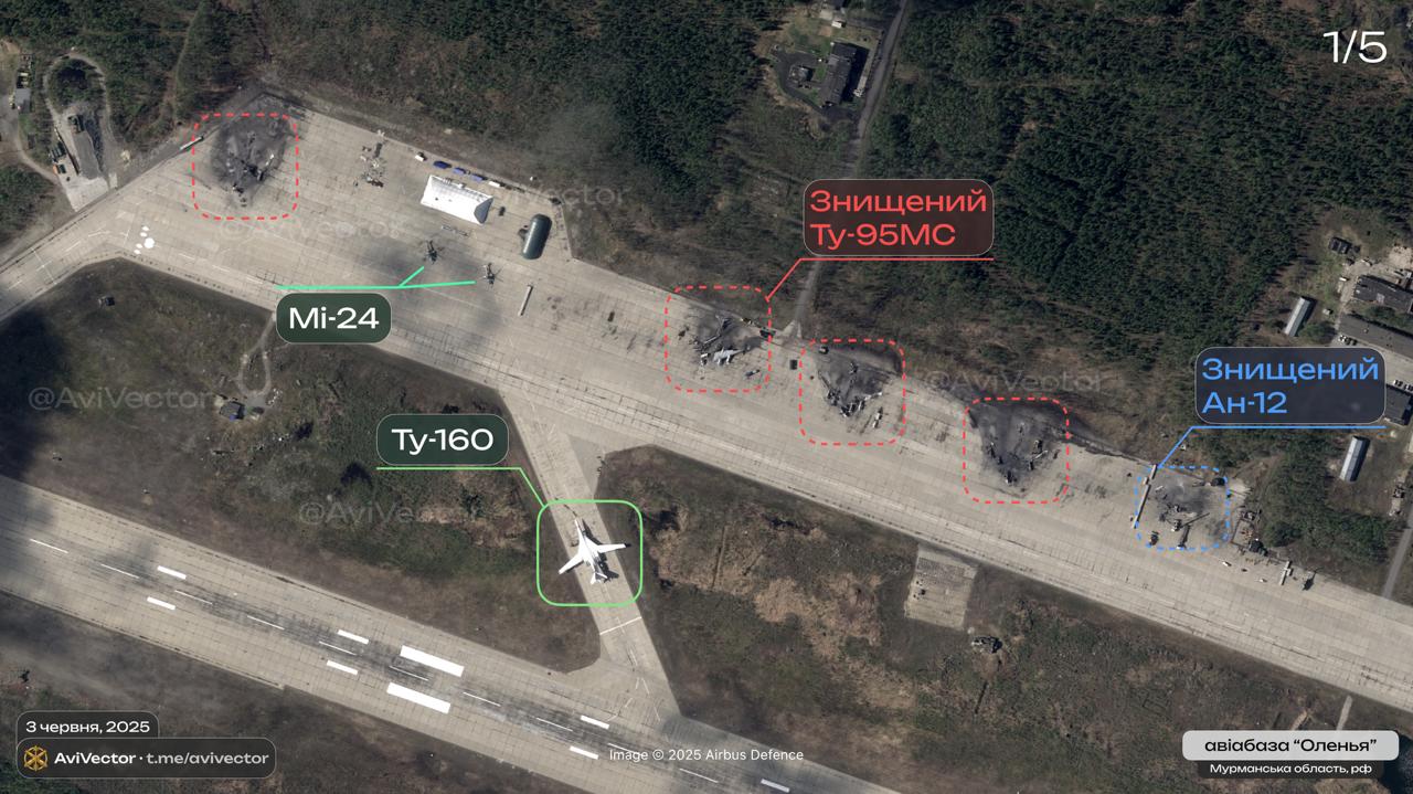 Опубліковані кадри, зроблені компанією Airbus Defence, демонструють знищення та пошкодження літаків. На одному зі знімків в одній частині видно три знищені Ту-95 і один Ан-12, а на відстані - ще одне судно.