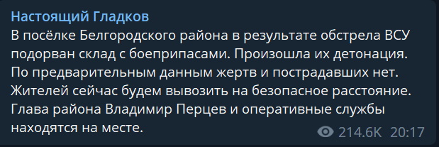 Губернатор Білгородської області В'ячеслав Гладков заявив, що внаслідок обстрілу ЗСУ було підірвано склад із боєприпасами, який було розміщено у селищі. Внаслідок чого відбулася їхня детонація.