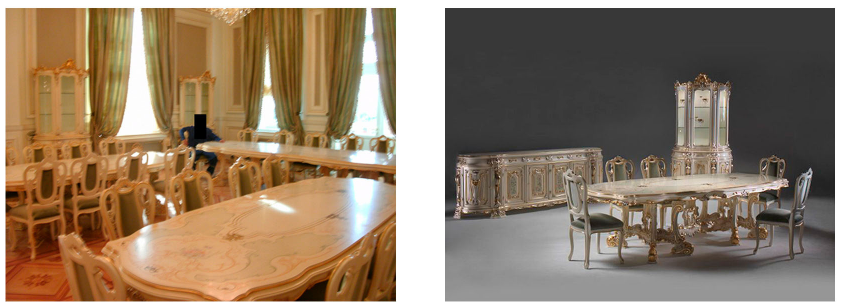 На фото з їдальні видно столи, стільці та серванти з вензелями. На плані приміщення позначено як "малий обідній зал".