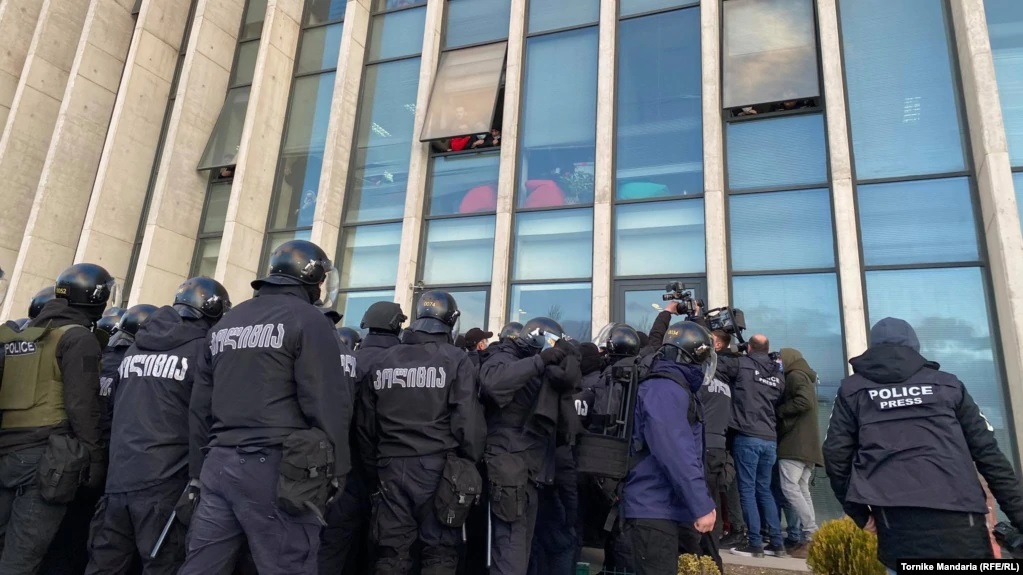 У будівлі знаходилися прихильники опозиційної партії, які не чинили опору, проте спецназ із застосуванням перцевого газу провів їх затримання, затриманих вивели з офісу. Ніка Мелія з декількома журналістами замкнувся в одній з кімнат на третьому поверсі будівлі, проте теж був затриманий.