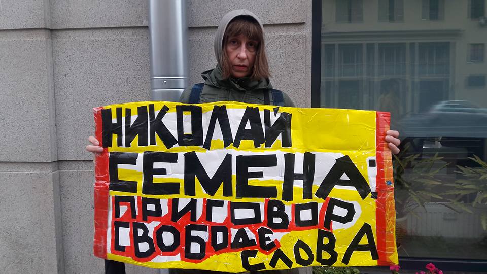 Активісти тримали плакати на підтримку переслідуваних владою РФ з політичних мотивів людей, зокрема, фігурантів справи "Хізб ут-Тахрір", російського публіциста Бориса Стомахіна, засуджених у Криму лідерів кримськотатарського національного руху Ахтема Чийгоза і Ільмі Умерова, кримського журналіста Миколи Семени, а також українського режисера Станіслава Клиха.