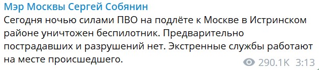 "Сьогодні вночі силами ППО на підльоті до Москви в Істринському районі знищено безпілотник. Попередньо постраждалих і руйнувань немає", - написав Собянін.