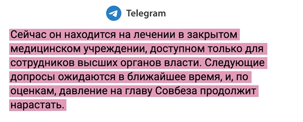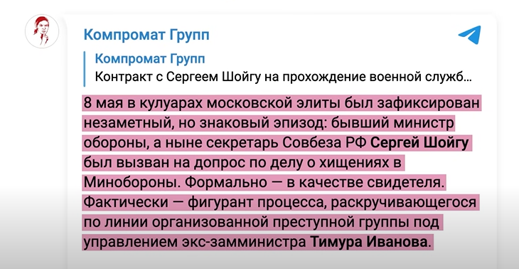 Ще один російський Telegram-канал виклав кардинально іншу версію, заявивши, що 8 травня Шойгу нібито був на допиті, який тривав три години. Після - його начебто екстрено госпіталізували в лікарні з гострим гіпертонічним кризом та симптомами передінфарктного стану.