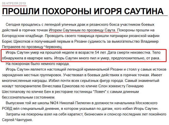 Бойовик багато пив і помер в Рязані, імовірно, від раку, на початку квітня 2019 року.