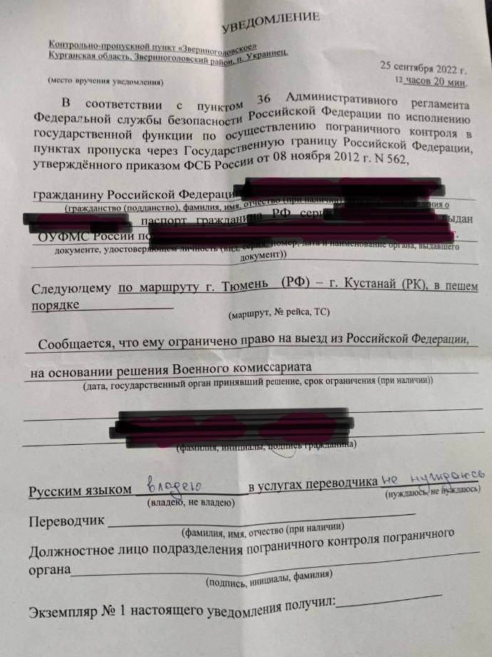 Крім того, вже з'явилися перші зафіксовані факти заборони на виїзд з боку прикордонної служби ФСБ, про що поінформував адвокат Павло Чіков, повідомляє Telegram-канал Baza. Є випадки заборони на виїзд із РФ за маршрутом Тюмень-Кустанай у пішому порядку, а також Москва-Уральськ за 25 вересня.