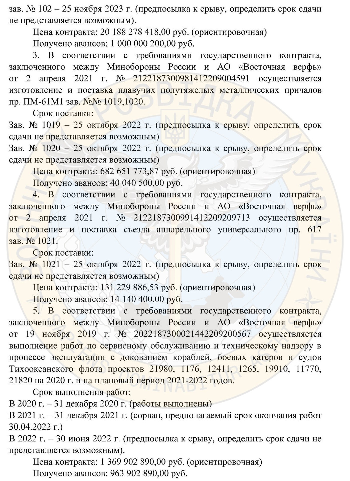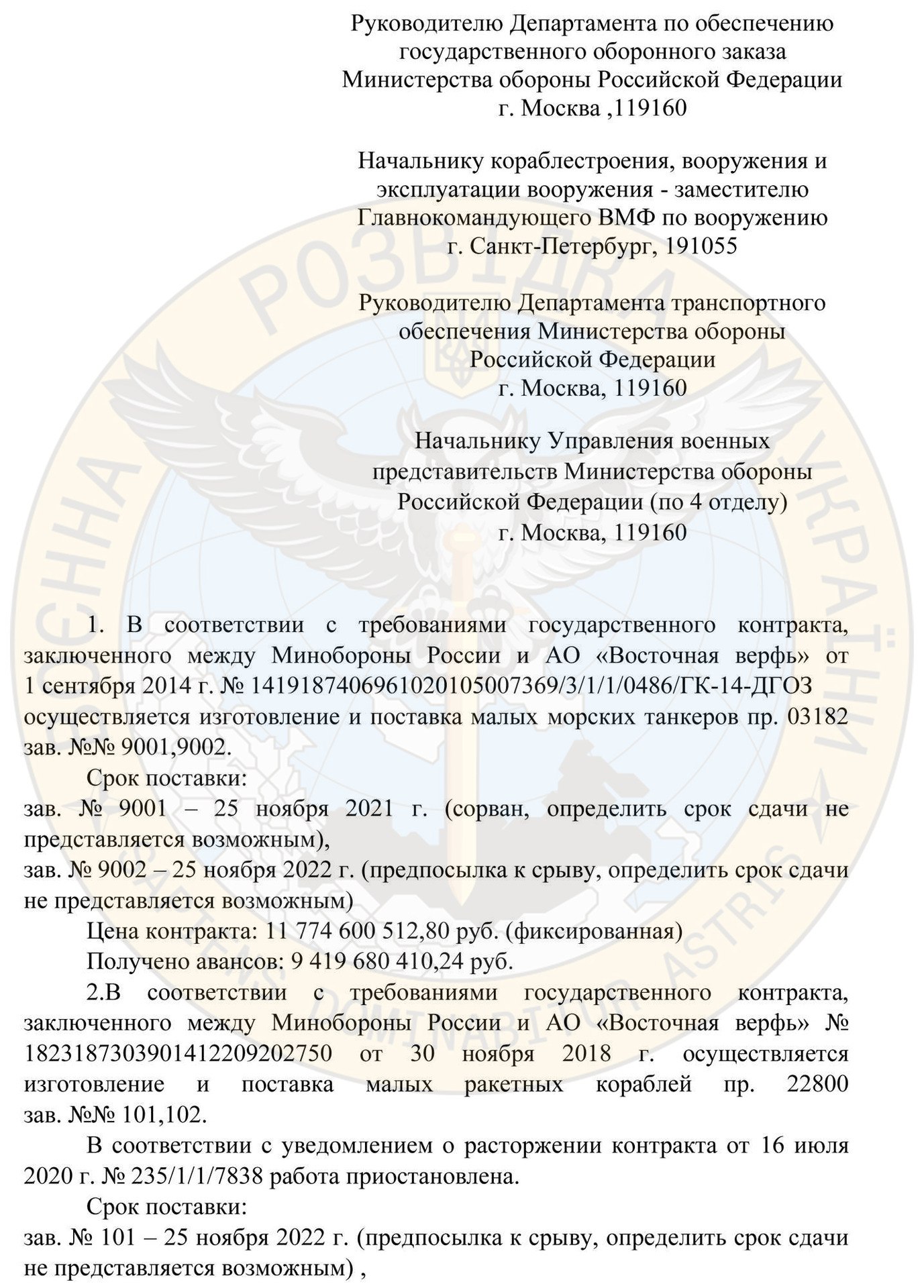 Зазначається, що АТ "Східна верф" у Владивостоку, яка має виконати держзамовлення на загальну суму 35 млрд руб., у тому числі будівництво та постачання двох морських танкерів та двох малих ракетних кораблів, на початок квітня через скрутне фінансове становище призупинила всі роботи та звільняє працівників.