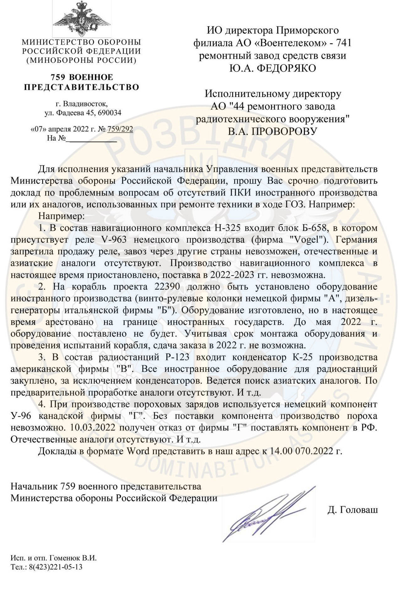 Відсутні іноземні комплектуючі для продовження робіт з будівництва військових кораблів і систем для них, а знайти російські або азіатські замінники неможливо. Крім того, з тієї ж причини зупинено виробництво порохових набоїв для морської артилерії.