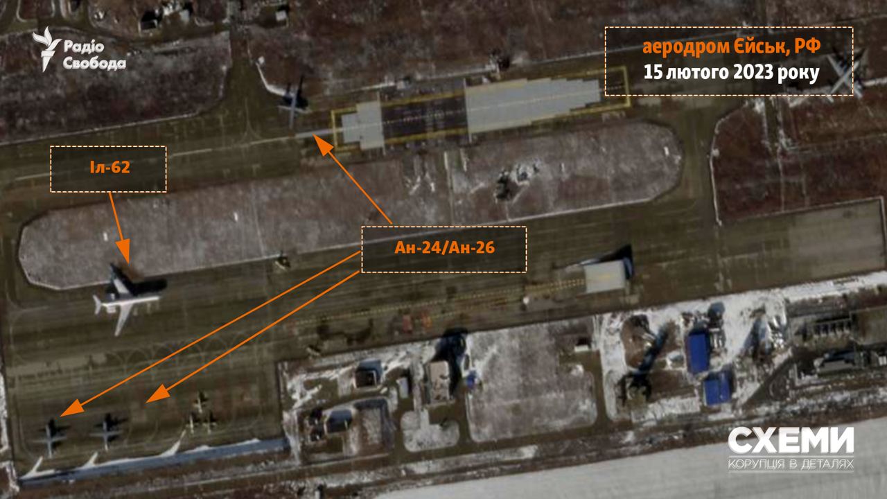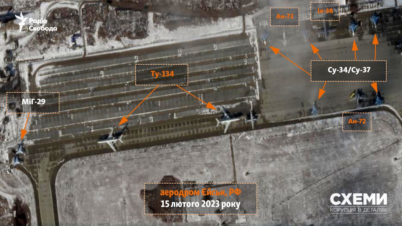 У центральній частині аеропорту станом на 15 лютого перебували три Іл-38, один Ан-72 і три Су-27.