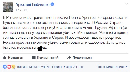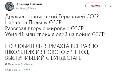 Під час виступу школяр назвав солдатів Вермахту "невинно загиблими людьми" і поскаржився на те, що їхні могили в Росії знаходяться в жахливому стані.