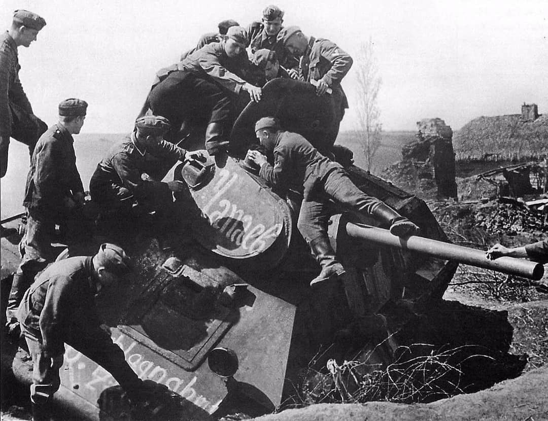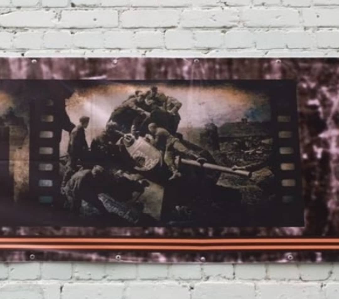 На одній з вивішених фотографій німці оглядають підбитий радянський танк Т-34, а на інший відображена Сталінградська битва очима солдат Третього рейху.