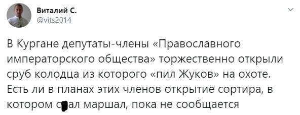 Виявляється, що з 1948 по 1953 роки Георгій Жуков був командувачем Уральським військовим округом. А в Шадринский район він нерідко приїжджав на полювання і пив з місцевого колодязя воду.