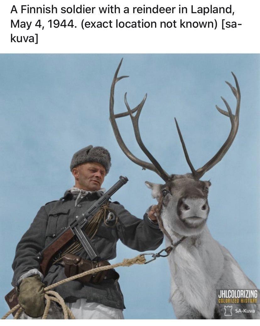 "Фінський солдат з північним оленем біля складу зброї в фінській Лапландії 4 травня 1944 року - останнього року "Війни-продовження". Олені використовувалися в фінській армії, наприклад, для перевезення вантажів по снігу. Солдат тримає автомат Suomi KP\31" - йдеться в підписи до оригінального фото.