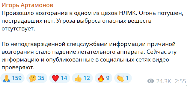 Так, вибухи пролунали на Новолипецькому металургійному комбінаті (НЛМК), внаслідок яких виникла пожежа в одному із цехів. Як стверджує Артамонов, на даний момент вогонь загашено, а постраждалих нібито не зафіксовано.