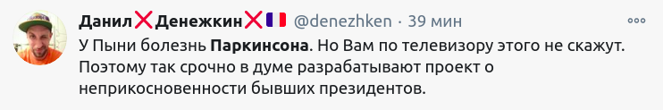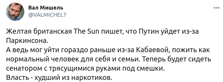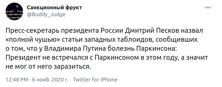 Західні ЗМІ припускають, що президент Росії Володимир Путін, можливо, страждає на хворобу Паркінсона, оскільки недавно у нього спостерігалися симптоми цієї хвороби