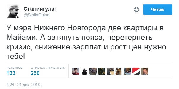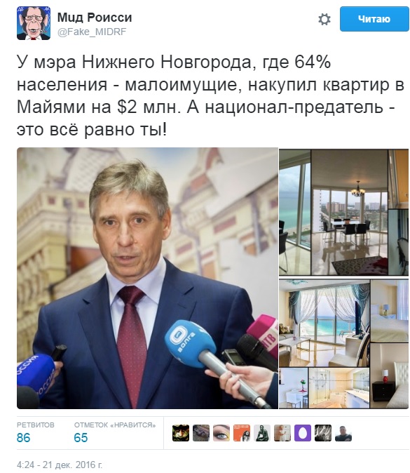 Відомий російський опозиціонер Олексій Навальний заявив, що мер міста Нижній Новгород, член прокремлівської партії "Єдина Росія" Іван Карнілін таємно придбав дві квартири в місті Майамі (США, штат Флорида) вартістю 130 мільйонів рублів (близько 2,1 млн дол).