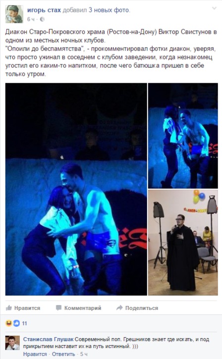 Користувачі соціальних мереж бурхливо обговорюють фотографії, на яких зображений диякон і викладач Донського державного технічного університету Віктор Свистунов. На кадрах відображено як священик танцював стриптиз в одному з нічних клубів Ростова-на-Дону.