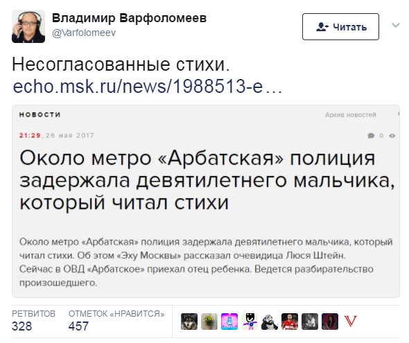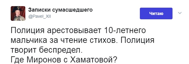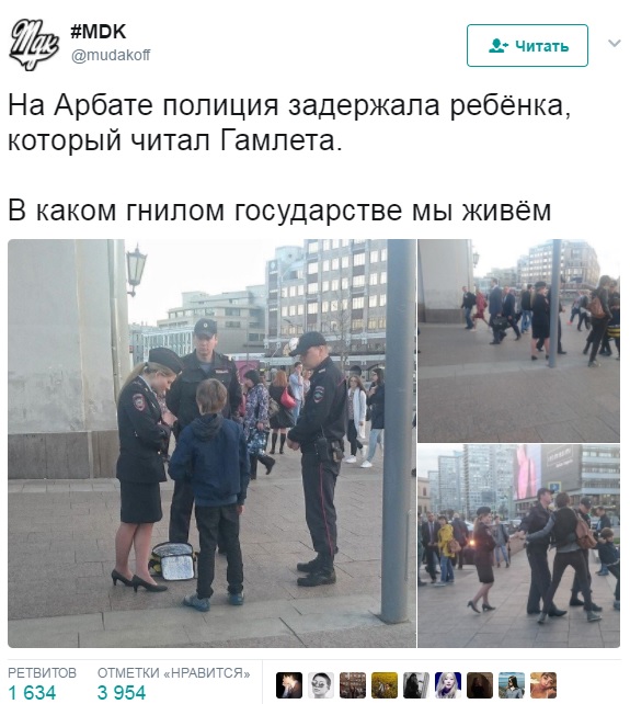 У центрі Москви поліцейські затримали 10-річного хлопчика, який декламував фрагменти з "Гамлета" Вільяма Шекспіра, і відвезли його в ОВС, незважаючи на протести мачухи дитини.