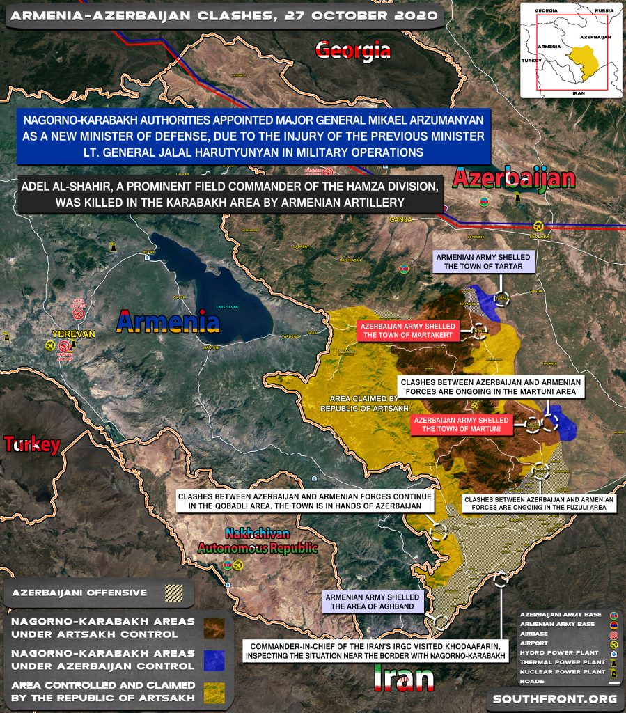 Також повідомляється, що в районі Карабаху вірменською артилерією був убитий Адель аль-Шахір, польовий командир дивізії Хамза. Також стало відомо, що в ході бойових дій отримав поранення карабахський міністр оборони Джалал Арутюнян.
